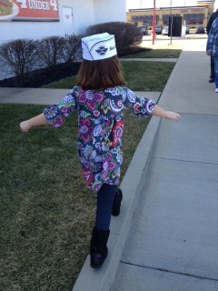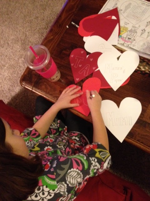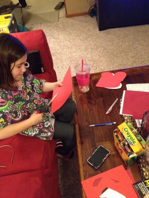 So we spent the day….just hanging out. Nothing special. We went to the other nephew’s basketball game. We ate lunch at her favorite, Steak n Shake (and my favorite too). We shopped at Menard’s and Home Depot. She wasn’t too thrilled but she participated. We hung out at home and made Valentine’s. We went grocery shopping. We watched those annoying lovely Disney shows. We had a few disagreements.