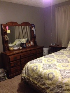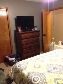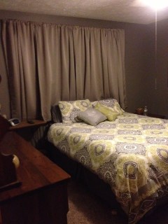 So, today I’ll reveal to you the before and after of our bedroom. It’s the only room that is completely finished. There are no open walls to hang things so it makes it very nice and easy to say it’s done. Furniture is in it. Curtains are up. New bedding is on. Done. Complete.
