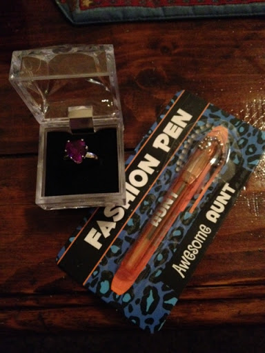 I love that my niece bought special gifts for many of us from a “store” at her school. She must get it from her momma. I wanted to cry watching each of us open her special gifts. Her face. Their expressions. Her face to see their excitement. She is just like her momma….a huge gift giving heart. I loved it. I got this ring that is our birthstone and a special AUNT pen. Straight from her heart. She even gave her Unkie a compass so he wouldn’t get lost when he went hunting. She gave each person she loved something special just for them.